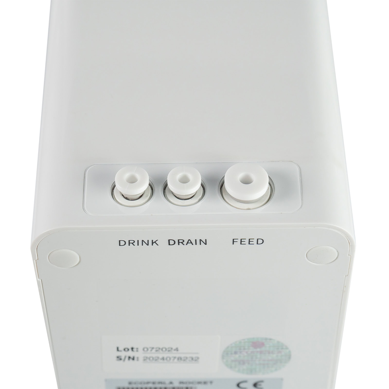 The Ecoperla Rocket tankless reverse osmosis removes fine solid contaminants, disinfection by-products, microplastics, pharmaceuticals, heavy metals, viruses and bacteria and reduces the hardness of tap water. It is easy to use, takes up little space, delivers water quickly (1.6 l/min) and is easy to install.